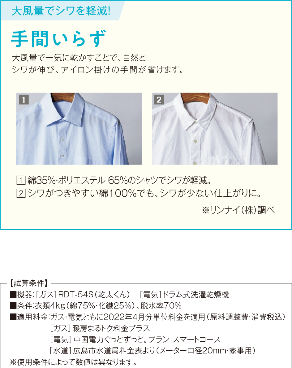 パワフルな乾太くんなら、4kgの洗濯物を約52分で乾燥。電気式の約1/3の時間で済むので、家事時間を大幅に短縮できます。